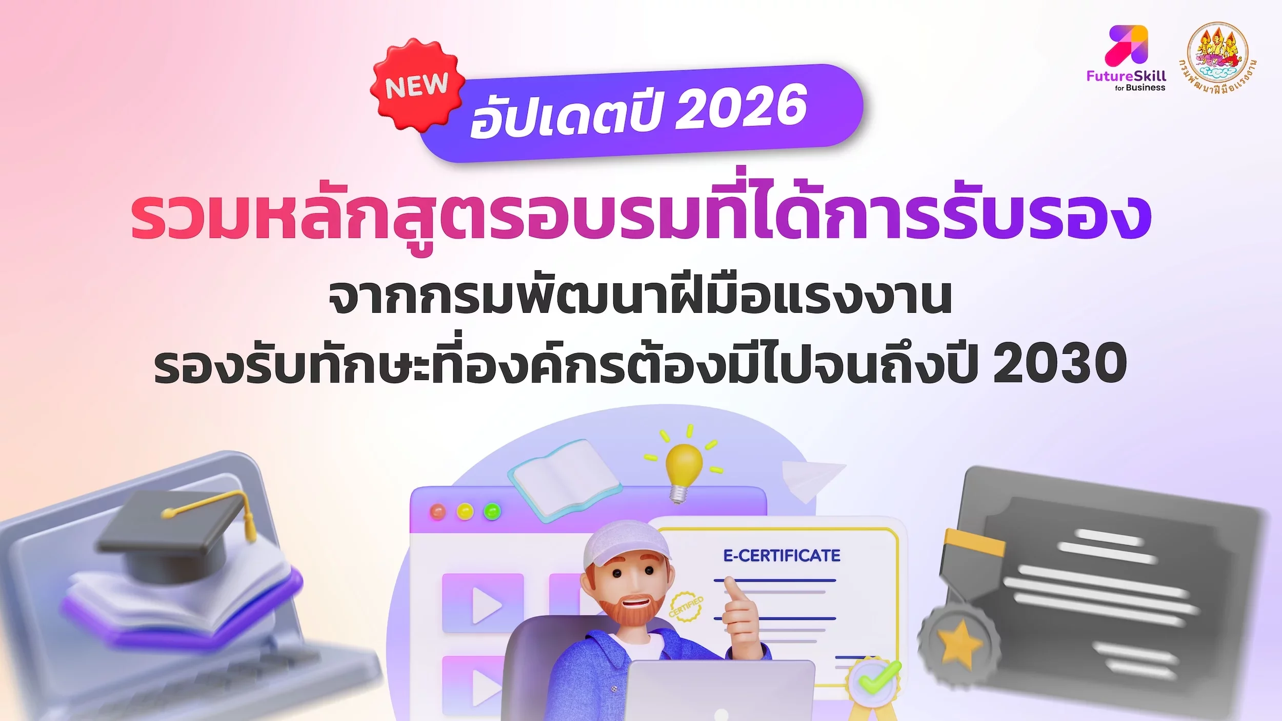 รวมหลักสูตรอบรมออนไลน์ที่ได้รับการรับรองจากกรมพัฒนาฝีมือแรงงาน ปี 2026 จาก FutureSkill for Business กว่า 90 หลักสูตร ช่วยองค์กรลดหย่อนภาษี พร้อมพัฒนาทักษะสู่ Core Skills 2030